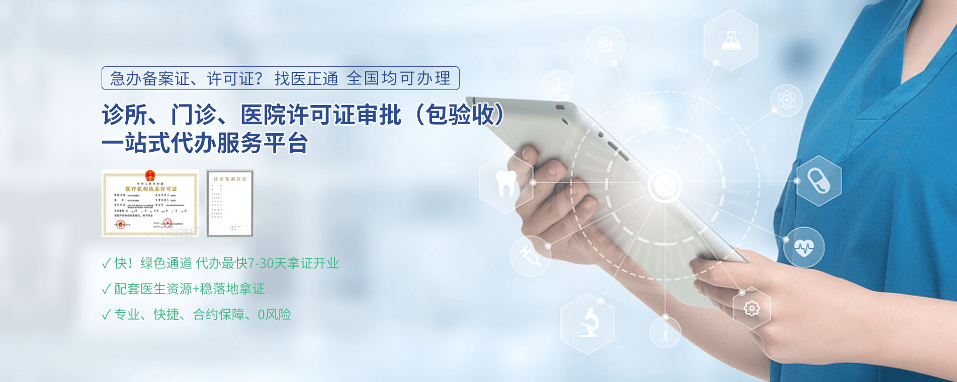 核心团队由资深医疗行业顾问、法律专家及前卫生行政部门审核人员组成,深耕医疗资质代办,多年行业经验,完善健全的标准服务体系及医疗机构设置咨询服务。熟悉各部门的办事流程和规则,不会浪费多余的咨询时间。